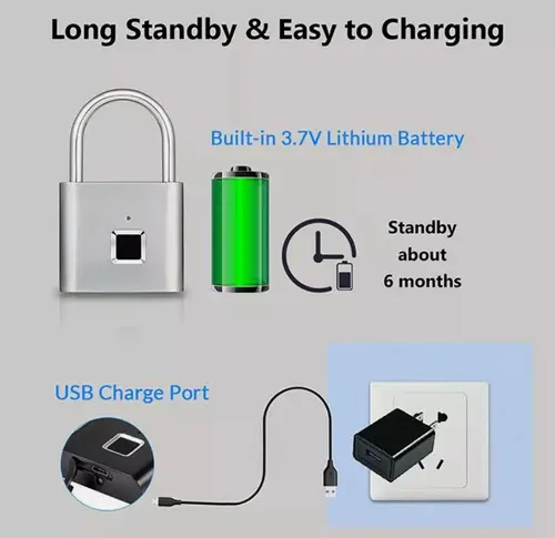 Este candado incorpora lector de huella con capacidad para hasta 10 perfiles, carga vía USB en apenas 2 horas y permite hasta 9.000 aperturas con una carga completa. Con indicador LED y diseño sellado para resistir lluvia y exterior. 🌧️